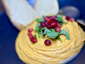Topped with pistachios, pomegranate seeds, & fresh basil. Served with toasted crostinis