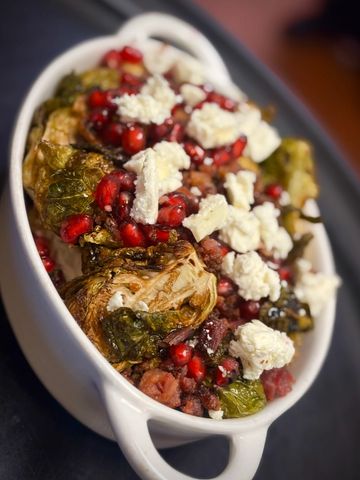 Crispy Brussels Sprouts with goat cheese, pomegranate seeds, balsamic drizzle, and bacon