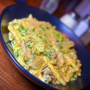 A creamy pumpkin pasta sauce with crumbled sweet Italian sausage, pistachios, kale, and toasted breadcrumbs, tossed with fresh long fusilli and finished with shaved parm