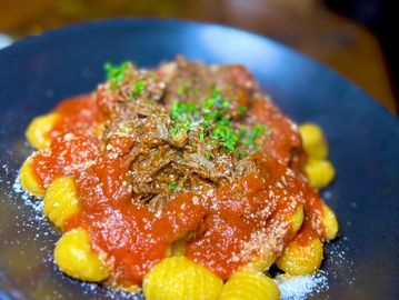 Braised beef over sweet potato gnocchi in a red wine tomato sauce
