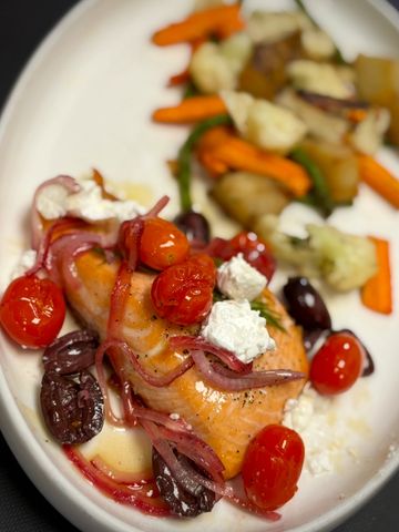 Baked Atlantic salmon topped with a white wine dill sauce, Kalamata olives, cherry tomatoes, red onions, and feta, served with seasonal vegetables and roasted potatoes