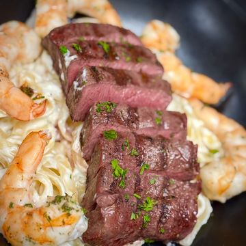 6 oz, locally sourced flat iron steak cooked medium rare with grilled shrimp, served over fettuccine in our homemade alfredo sauce
