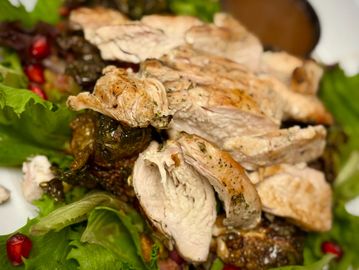 Crispy Brussels sprouts, bacon, pistachios, pomegranate seeds, feta cheese, and grilled chicken over spring mix with homemade balsamic dressing