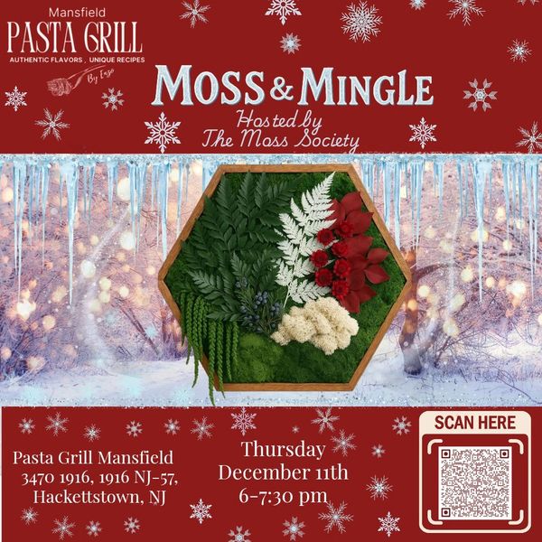 Join us for a cozy winter-themed Moss and Mingle workshop at Pasta Grill Mansfield in Hackettstown, NJ. Create your own preserved-moss hexagon panel inspired by winter greens, soft whites, and seasonal textures. No experience needed — just come ready to get creative and unwind.