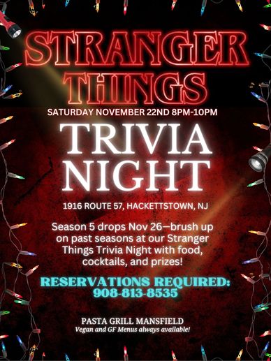 Join us for our Stranger Things trivia night! 8pm-10pm at Pasta Grill Mansfield! Themed cocktails, full dinner menu, vegan menu, gluten free menu, and prize for first place. Reservations required: 908-813-8535