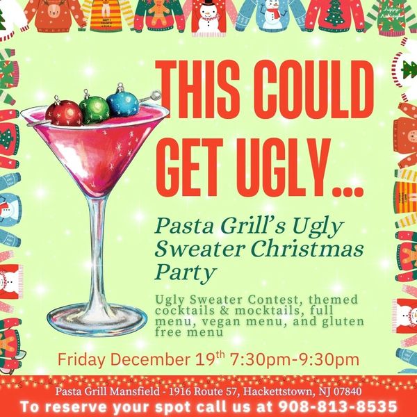 Join us at our annual Ugly Sweater Party! Christmas themed cocktails and mocktails, full menu, vegan menu, and gluten free menu. Call to reserve your seat now - 908-813-8535